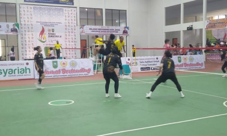 Di pertandingan final Minggu pagi, tim takraw putri Bumi Lancang Kuning memaksa tim sepak takraw Sumatera Barat menyerah kalah, 2-0 tanpa balas.