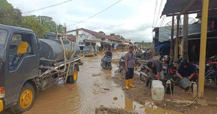 IndonesiaLineNews-Tapaktuan- Pasca banjir bandang beberapa hari yang lalu, Polres Aceh Selatan, Polda Aceh, menyalurkan air bersih untuk kebutuhan masyarakat korban banjir di Trumon Tengah, Kabupaten Aceh Selatan, Minggu (26/11/2023).