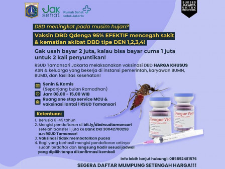 Adapun ketentuan vaksin DBD, yaitu berusia 6-45 tahun, mengisi pendaftaran di bit.ly/dbdrsudtamansari setelah melunasi pembayaran vaksin dengan cara tranfer ke nomor rekening Bank DKI 30042700298 a.n RSUD Taman Sari.