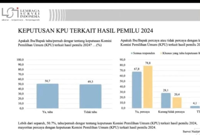 IndonesiaLineNews-Jakarta-Lembaga Survei Indonesia (LSI) mencatat 78,8 persen masyarakat mempercayai keputusan Komisi Pemilihan Umum (KPU) terkait dengan hasil Pemilu 2024