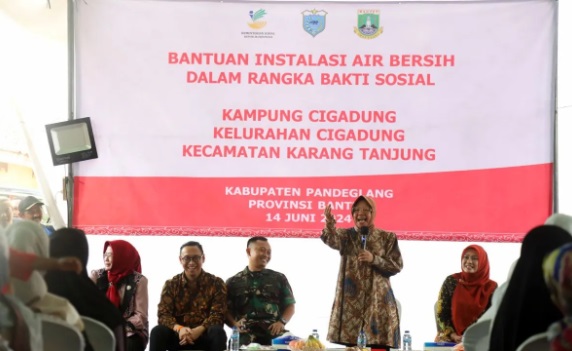 IndonesiaLineNews-Jakarta-Menteri Sosial (Mensos) Tri Rismaharini memberikan bantuan pengeboran air tanah dan pemasangan instalasi pengolahan air bersih di Kabupaten Lebak dan Pandeglang, Provinsi Banten.