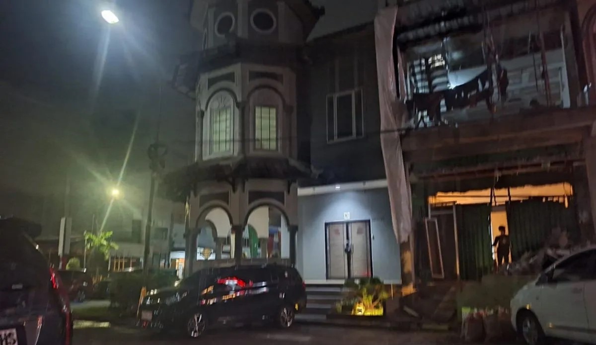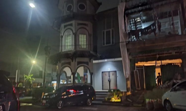Di samping ruko tersebut, terdapat sebuah rumah ruko lantai tiga yang sedang dalam tahap renovasi dan tetap beraktivitas.