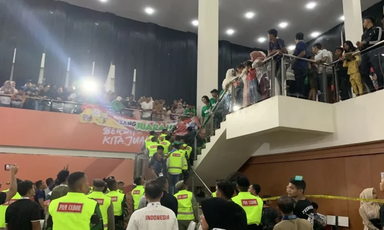 Petugas keamanan berupaya melerai sejumlah ofisial Jawa Timur dan Banten yang cekcok tapi sejumlah penonton yang berada di tribun mencoba merangsek ke kawasan pertandingan.