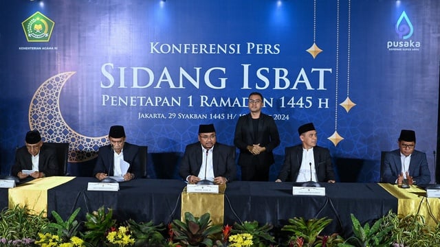 “Hasil Sidang Isbat menetapkan 1 Ramadhan 1446 Hijriah jatuh pada hari Sabtu,” ujar Menteri Agama Nasaruddin Umar saat memimpin konferensi pers penetapan sidang Isbat.