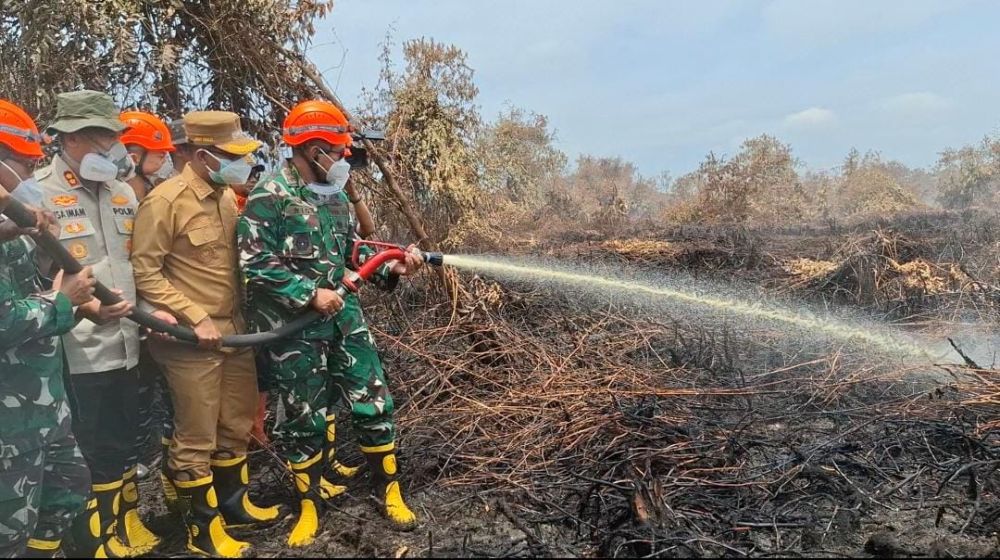 Berlahan, jenderal bintang dua itu langsung masuk ke lahan yang sudah terbakar. Tak mau buang waktu, Rio dan rombongan lalu menarik selang dan menembakkan nozel air tepat ke titik api.