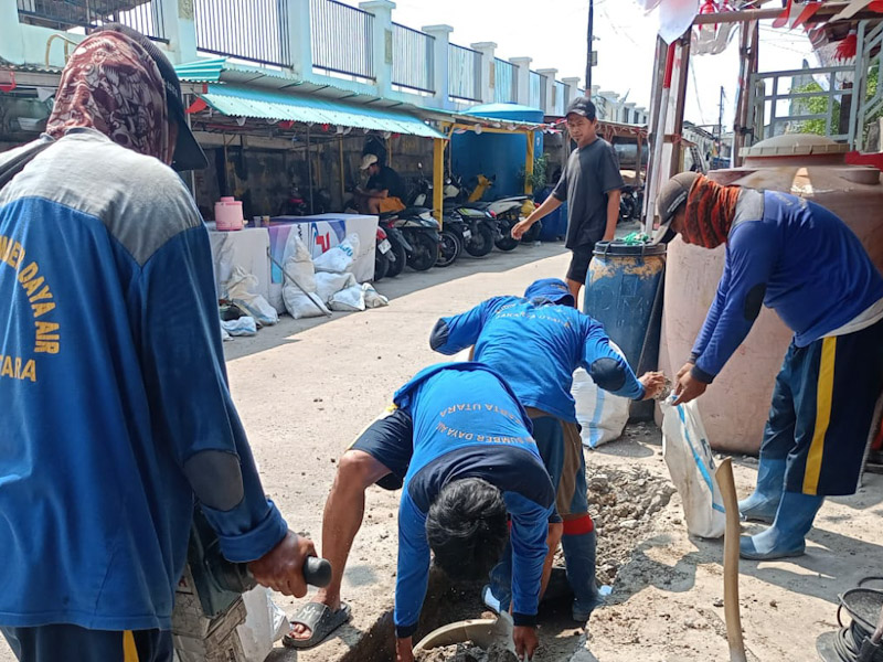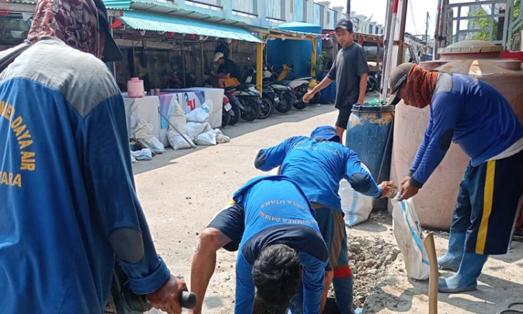 Teropongtimeindonesia-Jakarta-Personel Pasukan Biru Satuan Pelaksana Sumber Daya Air (Satpel SDA) Kecamatan Penjaringan, Jakarta Utara membuat saluran air baru di Jalan Muara Baru Ujung, RT 20/18, Kelurahan Penjaringan. Pengerjaan ditargetkan rampung akhir Agustus.