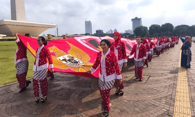 IndonesiaLineNews-Jakarta-Komunitas Cinta Kebaya Depok menggelar acara ‘Bentang Batik Spektakuler’ di kawasan Monas, Jakarta, Minggu (30/11).