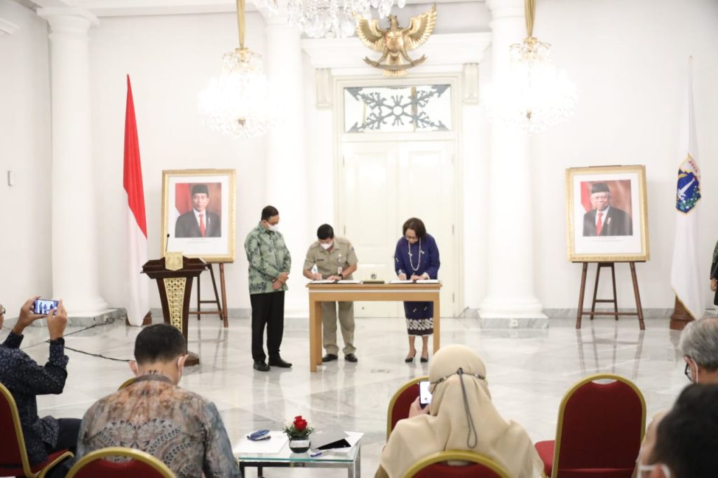 IndonesiaLineNews-Jakarta -Pemprov DKI Jakarta bersama PT PricewaterhouseCoopers (PWC) Consulting Indonesia menandatangani perjanjian kerjasama (MoU) terkait Dukungan Teknis Implementasi Sistem Pemerintahan Berbasis Elektronik (SPBE) dan Transformasi Digital di Pemprov DKI Jakarta. Turut hadir menyaksikan perjanjian tersebut Gubernur DKI Jakarta, Anies Baswedan bersama jajaran dan Presiden Direktur PT PricewaterhouseCoopers Counsulting Indonesia, Marina Reim Tusin, di Balairung Balaikota Jakarta, Senin (8/8) pagi.