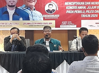 Ust Muchtar Dg Lau dalam pemaparannya menyatakan di Pemilu yang akan datang perlu kerjasama semua pihak mulai dari masyarakat sebagai wajib pilih, KPU, Pangwas, TNI/Polri untuk menjunjung tinggi pemilu yang Jujur, adil, tidak memaksakan kehendak untuk memilih salah satu calon. Sebagaimana sudah menjadi arahasia umum bahwa pada pemilu sebelumnya terjadi kecurangan disana-sini tapi tidak ada tindakan hukum yang memuaskan, apabila hal ini terulang lagi maka berpotensi untuk terjadinya gangguan keamanan pasca pelaksanaan pemilu. Dg Lau menyatakan bahwa apabila pelaksanaan pemilu nanti berlangsung secara jujur, adil, transparan dan tidak terjadi kecurangan maka otomatis pelaksanaan pemilu akan berlangsung damai dan hasil pemilu juga nanti akan dit6erima dengan legowo oleh semua pendukung yang ikut kontestan pemilu, siapapun yang terpilih nanti apakah calon yang kita dukung atau bukan sepanjang dia warga Negara Indonesia maka kita akan menerima dengan penuh rasa hormat untuk memimpin Indonesia 5 tahun akan datang, ungkap Dg lau.