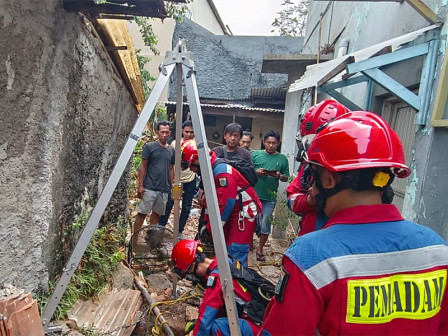 IndonesiaLineNews-Jakarta-Petugas Suku Dinas Penanggulangan Kebakaran dan Penyelamatan (Gulkarmat) Jakarta Timur, berhasil mengevakuasi warga Jalan Pesantren Albariyah, RT 03/03, Kelurahan Tengah, Kramat Jati yang terjebur ke dalam sumur, Rabu (1/11).